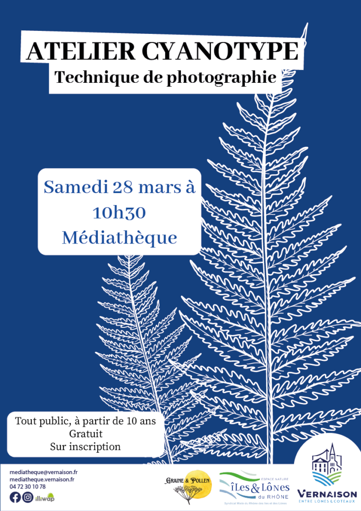 La médiathèque vous propose de vous initier au cyanotype, un ancien procédé photographique qui permet de créer de superbes empreintes végétales d’un bleu profond, appelé bleu de Prusse.